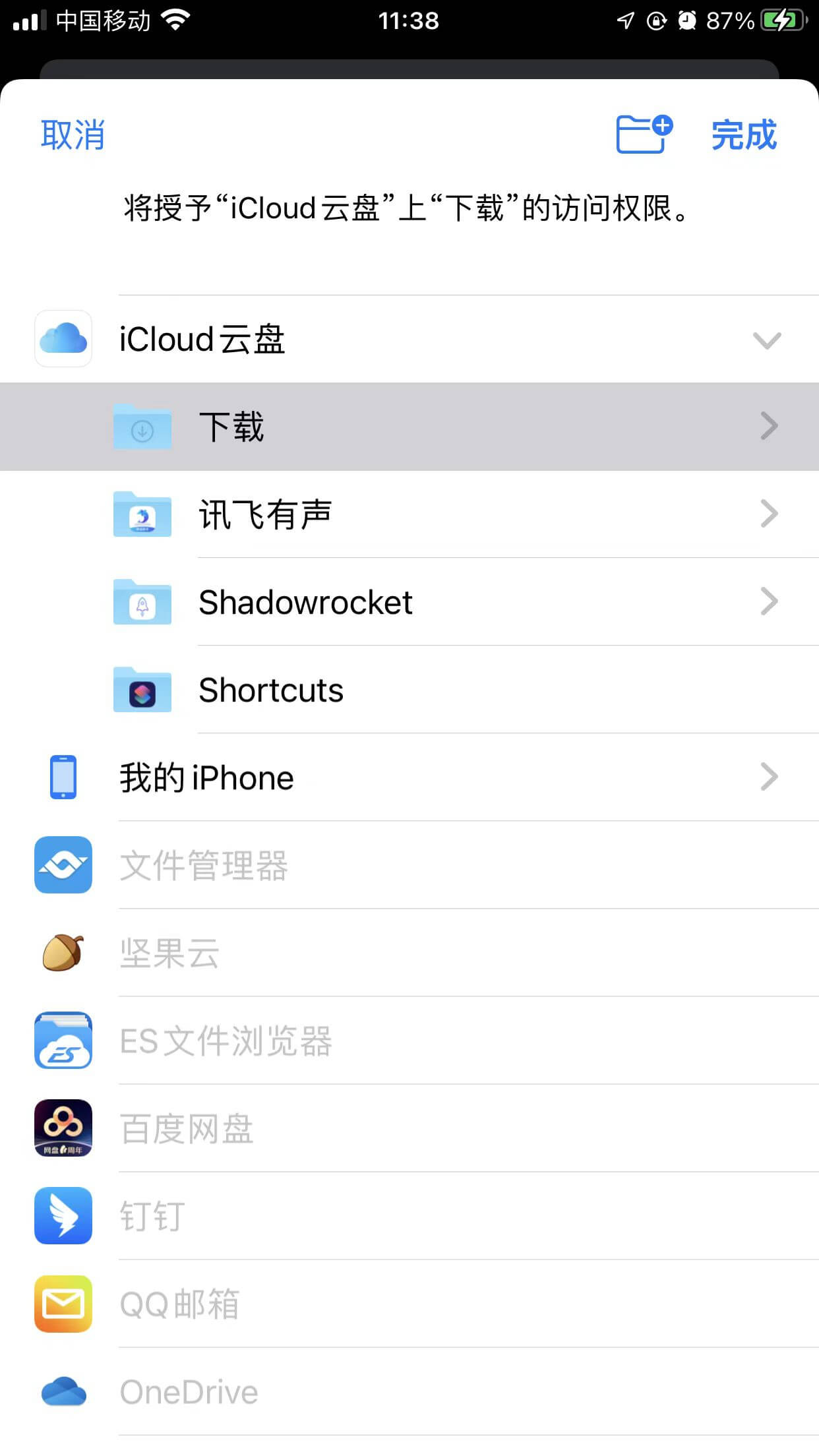 3.选择可以放置脚本的目录, 比如: iCloud云盘下的"下载", 也可以是其他目录, 然后点击"完成"。