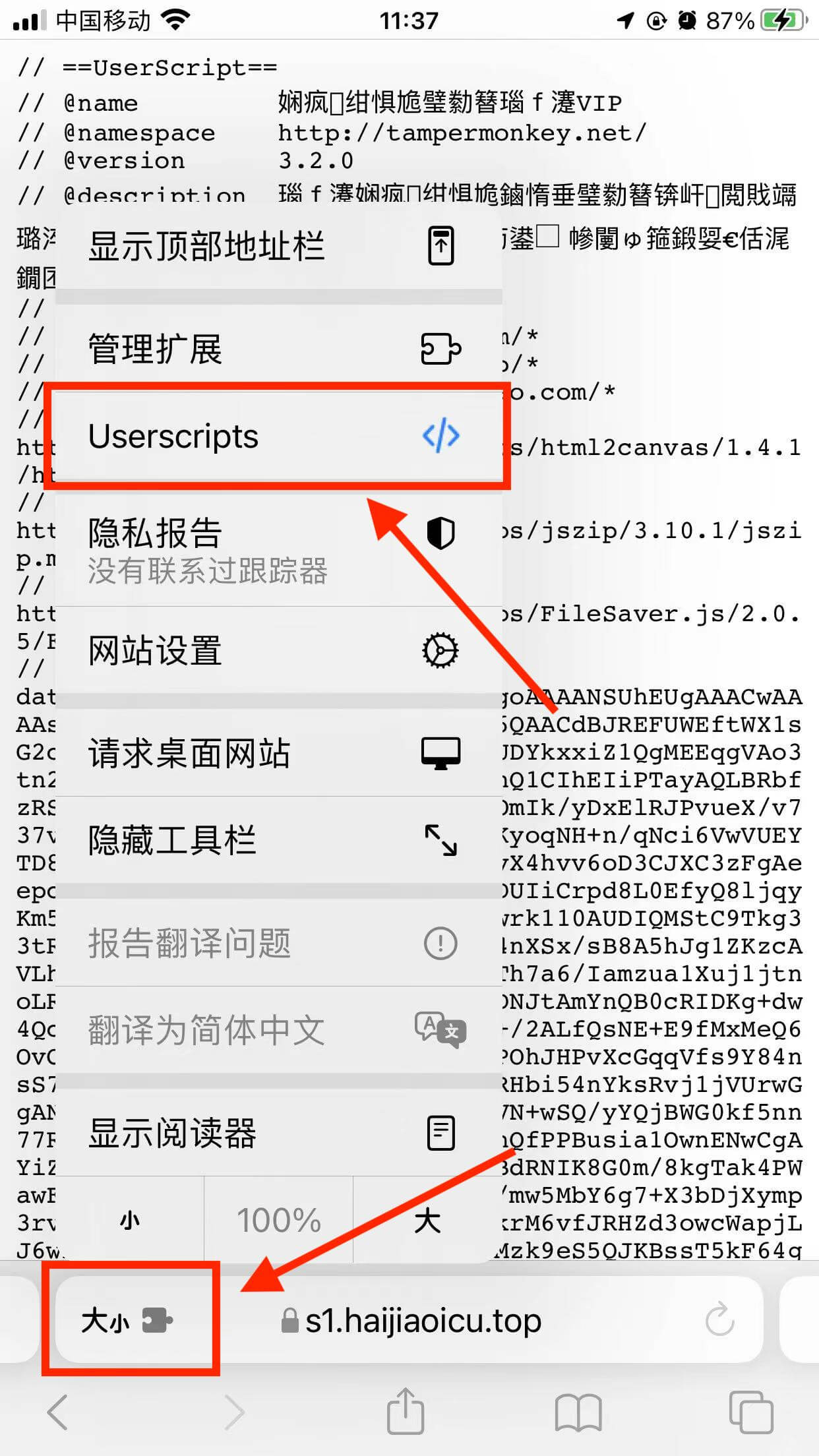 7.重新点击Safari浏览器左下角【大小】, 然后点击【Userscripts】。